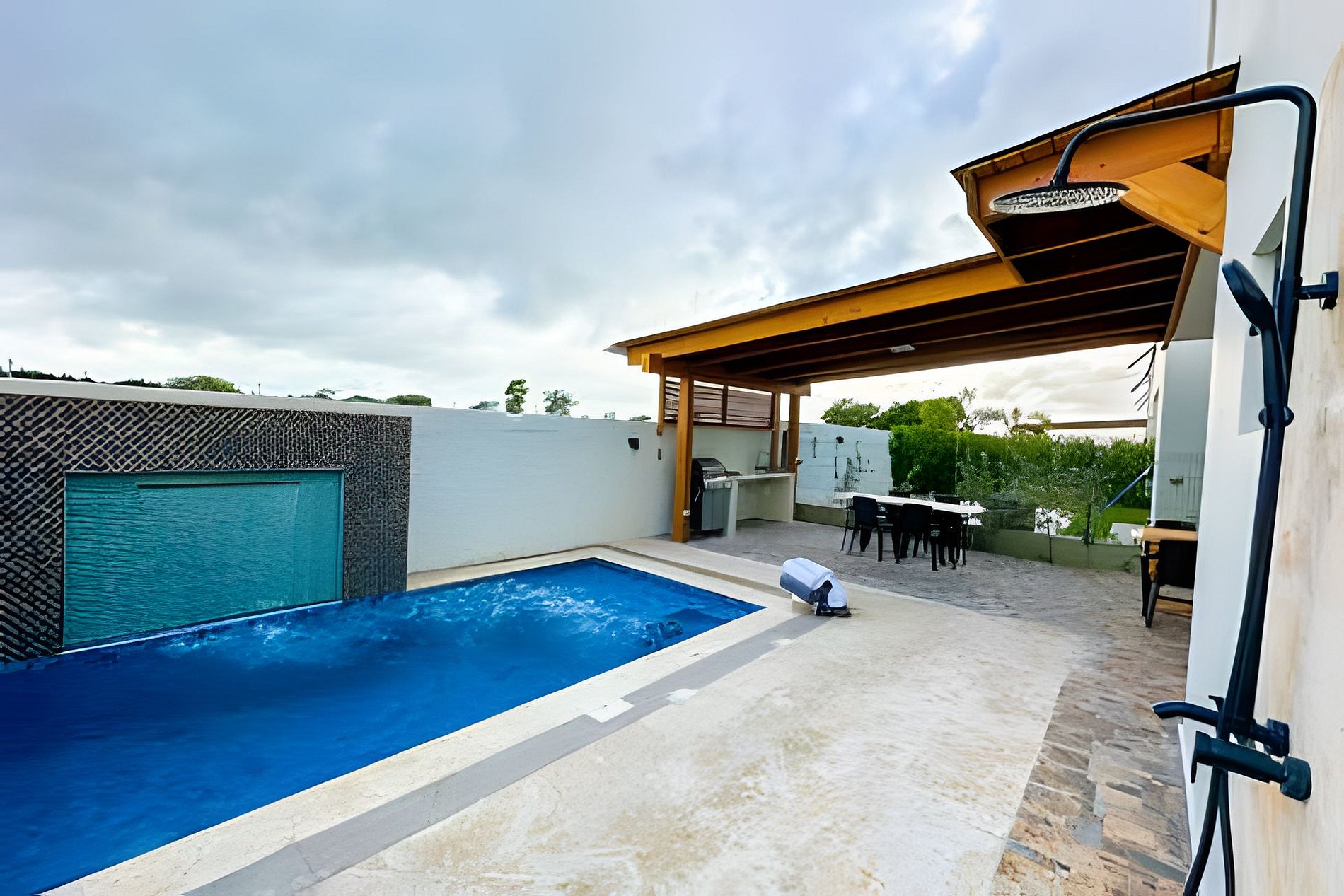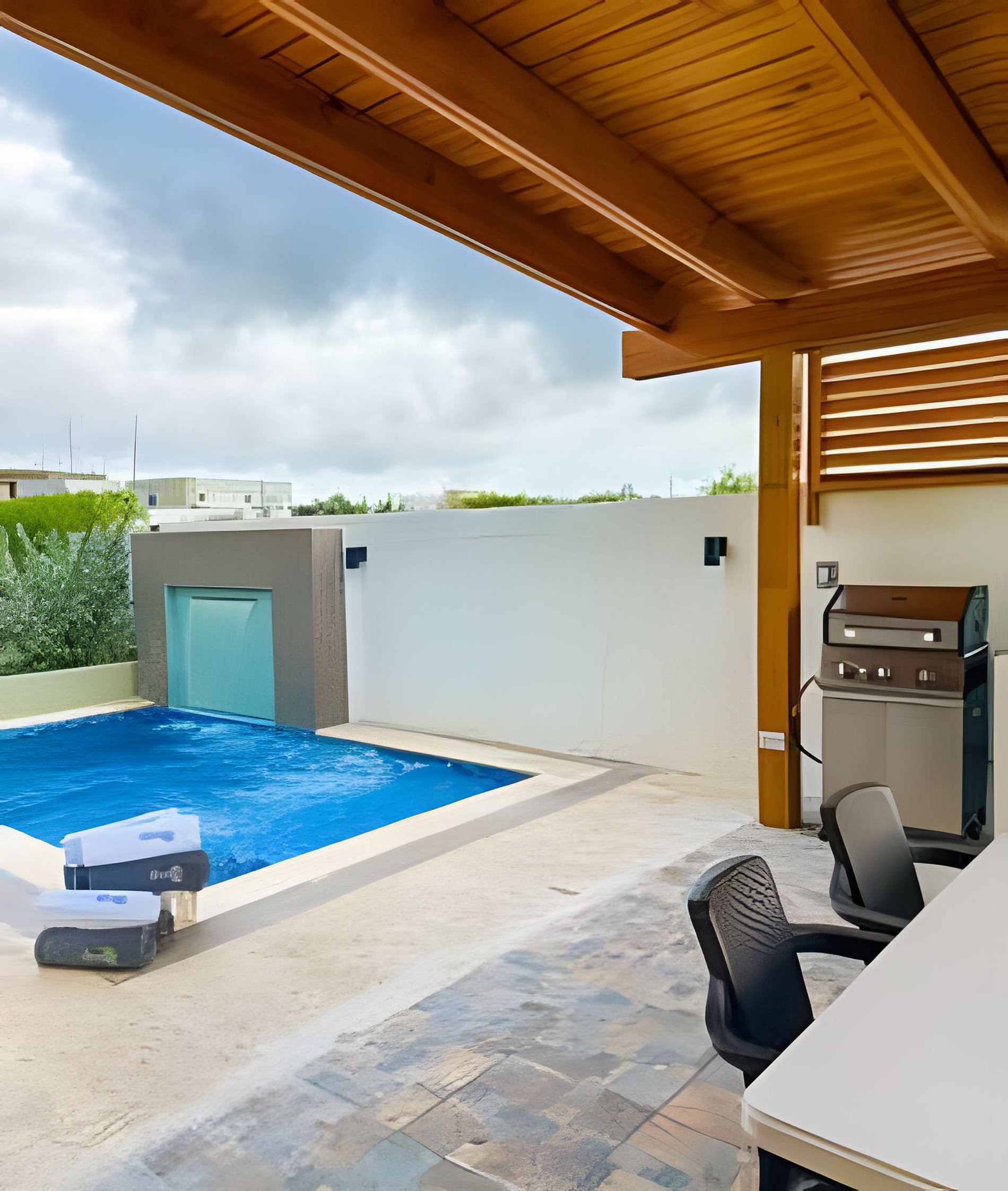 La villa dispone de una piscina privada climatizada con cascada en el patio, para uso exclusivo de los huéspedes. Al ingresar, recibirás una tarjeta de acceso que te permitirá entrar y salir del complejo por cualquiera de sus tres entradas, facilitando la movilidad y seguridad dentro de la zona.