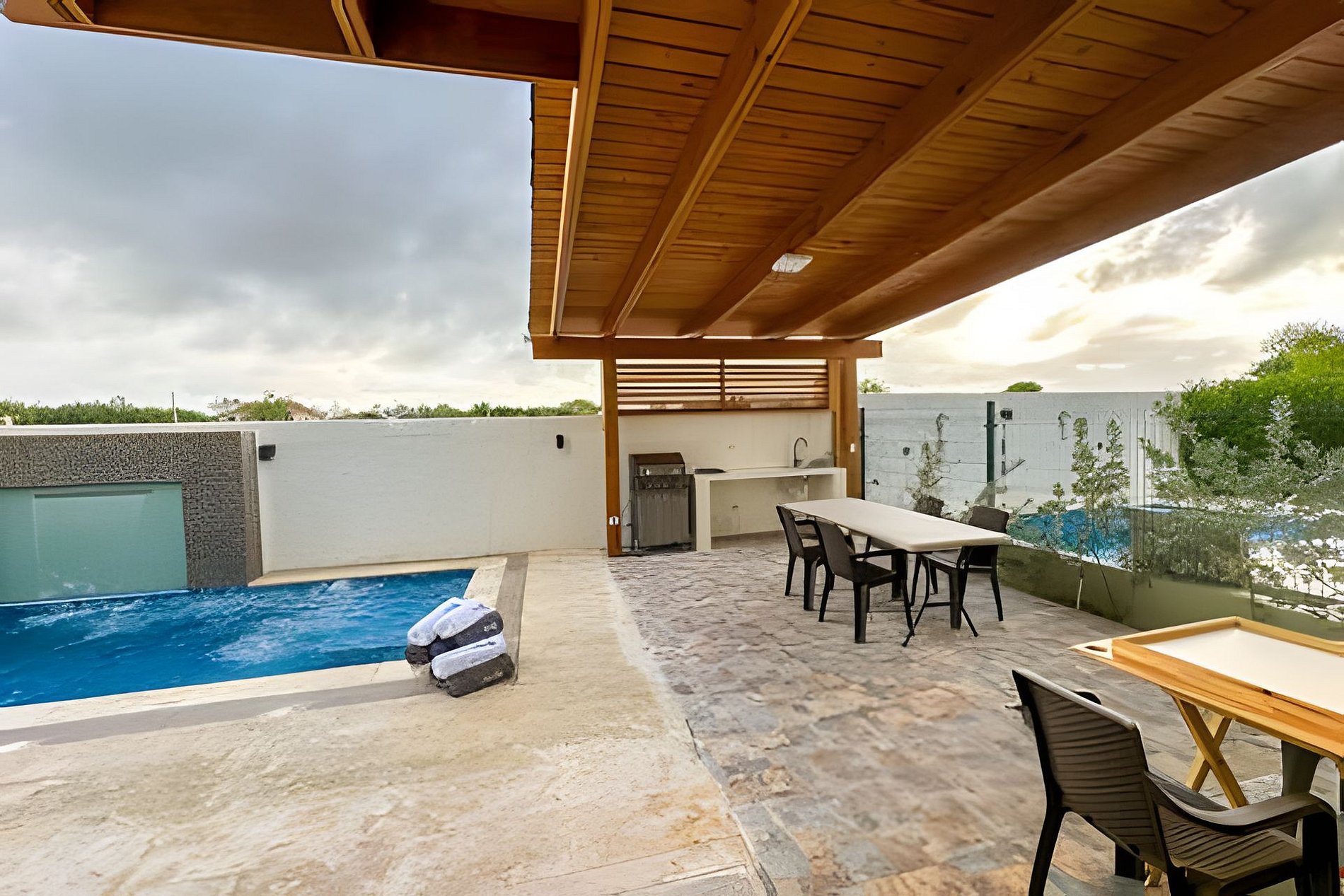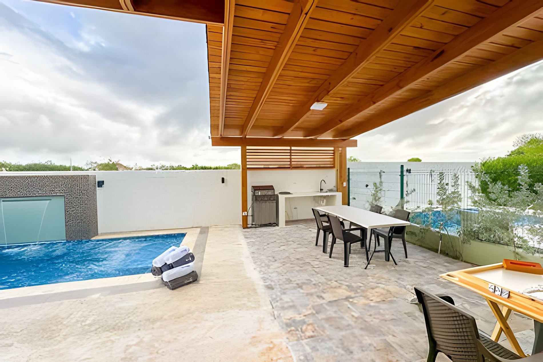 Características destacadas: 3 dormitorios espaciosos: privacidad y confort con camas lujosas y diseño moderno Piscina climatizada privada: un oasis para relajarte y disfrutar del sol Cocina totalmente equipada: ideal para preparar tus platillos favoritos Espacios de vida amplios: sala y comedor de concepto abierto para socializar Terraza al aire libre: perfecta para comidas con vista a la piscina y jardín Comodidades modernas: WiFi rápido, aire acondicionado y TV de pantalla plana