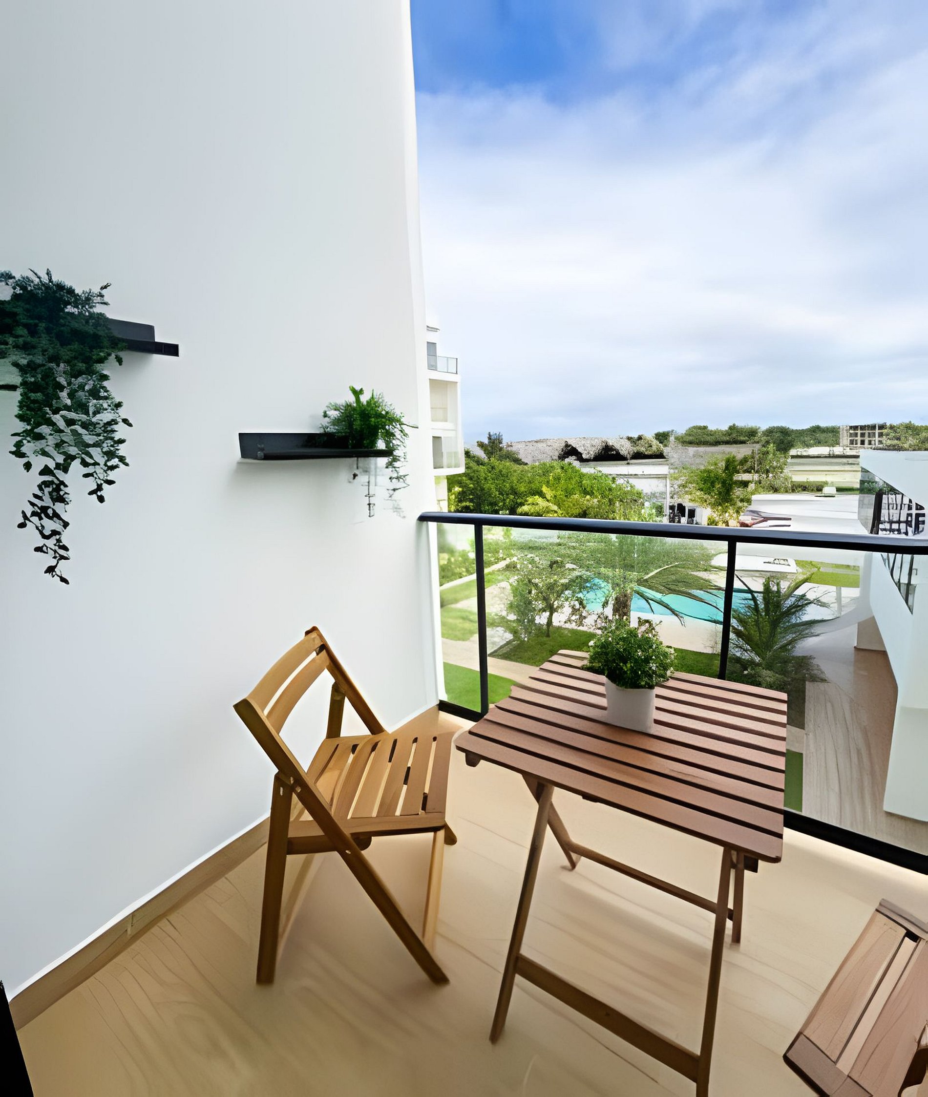 Características destacadas: Vista a la piscina desde una amplia terraza privada. Totalmente equipado con muebles modernos y acabados de calidad . Acceso a dos piscinas dentro del condominio. Ubicación privilegiada, a pocos pasos de los mejores atractivos de la zona: restaurantes, bares y actividades para el día y la noche. Es un acogedor departamento de un solo dormitorio, terraza, baño, cocina pequeña pero equipada adecuadamente para tu estadía. Para tu comodidad encontraras: Aire acondicionado television WIFI 5 kwh diarios de electricidad: si excedes este monto se te cobra cada kWh en base a la tarifa local. Una cama Queen comoda Sillas y mesa en la terraza para disfrutar de un café.